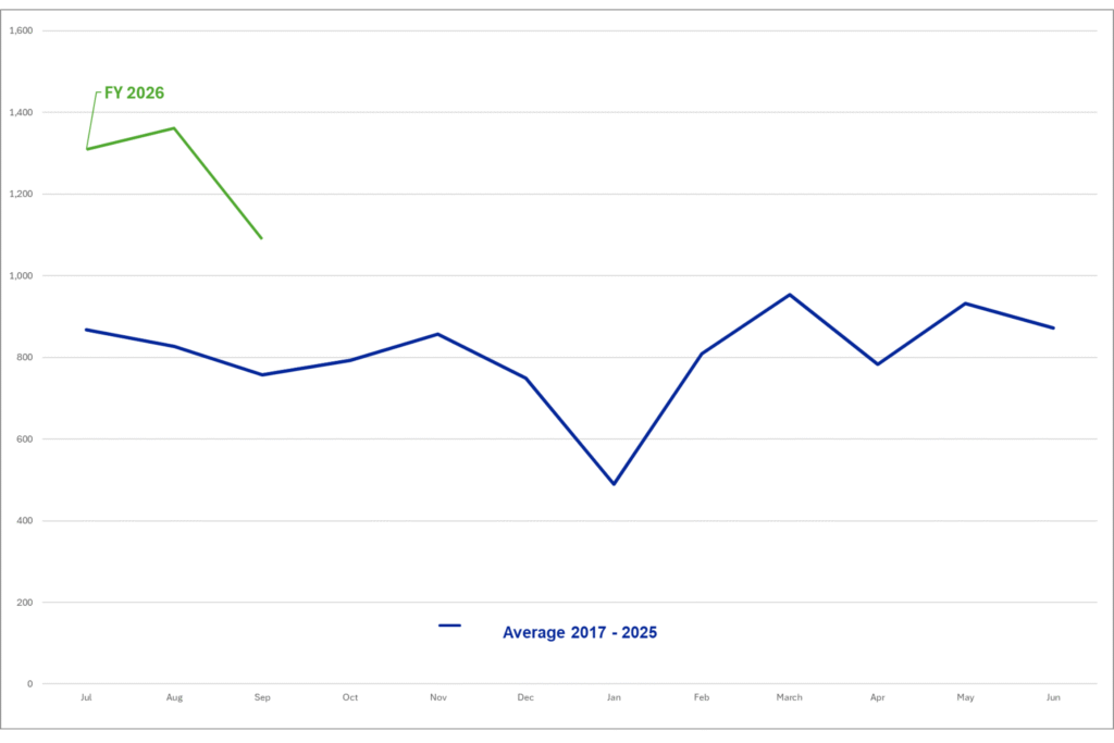 In August, 1,090 businesses entered external administration – still above the long-term monthly average of 827.33 but the first noticeable downturn towards the average we have seen in a long time.